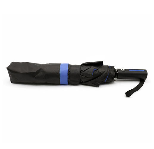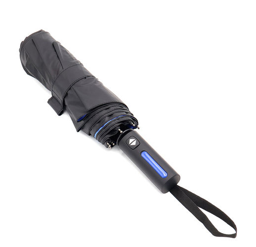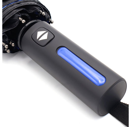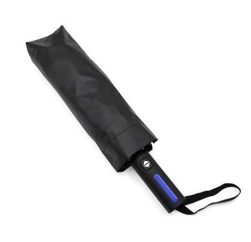 Автоматический противоштормовой складной зонт Sherp. Материал купола – эпонж. На таком материале вода превращается в капельки и скатывается, а сам зонт остается сухим. Цветной элемент на ручке – в тон купола. Ветрозащитная функция – спицы из стекловолокна, а специальное устройство препятствует поломке спиц при резких порывах ветра. Цвет по PANTONE® (максимально приближен): 3590C.
