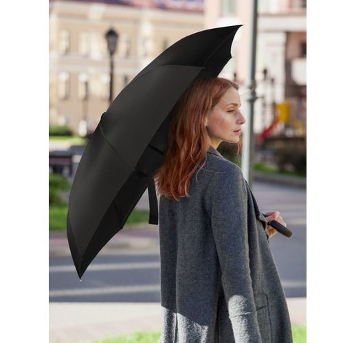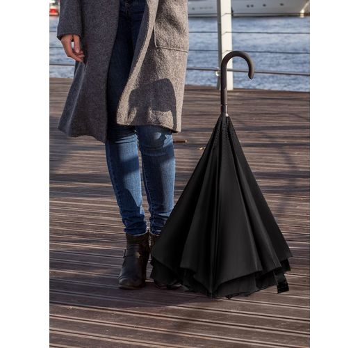 Это зонт-наоборот, зонт-наизнанку. Складываясь после дождя, он прячет мокрую поверхность в себя, а сухая остается снаружи. Для просушки его можно не только подвесить за ручку, как обычные зонты, но и поставить прямо на пол в полусложенном состоянии. Итог — мягкая щадящая просушка и минимум занятого мокрым зонтиком места.
