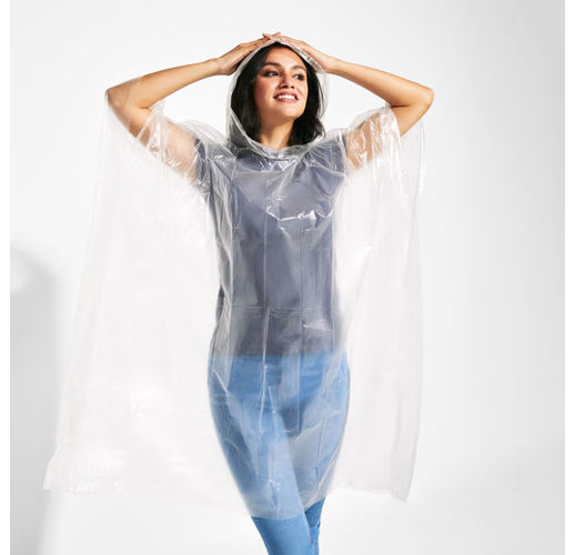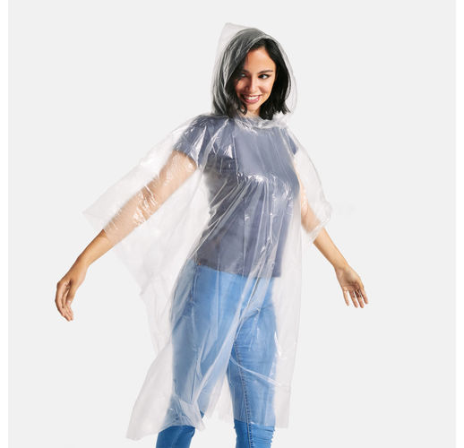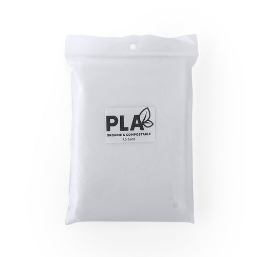 Прозрачный дождевик из компостируемого материала. Один размер для взрослых с капюшоном и отверстиями для рук. Поставляется в мешочке из PLA 10 x 13,5 см.