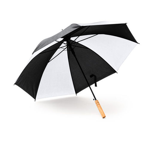 Зонт с деревянной ручкой и автоматическим открыванием. Ребра и наконечники черного цвета. Застежка на липучке.