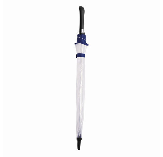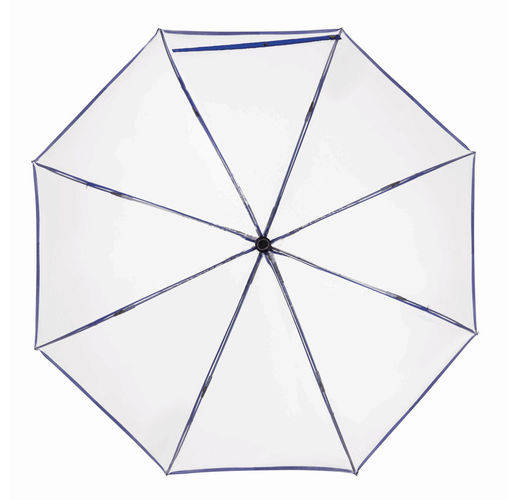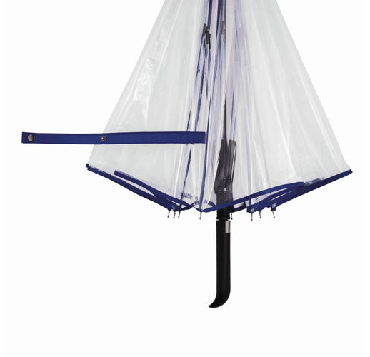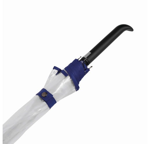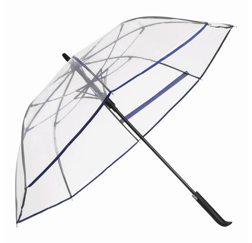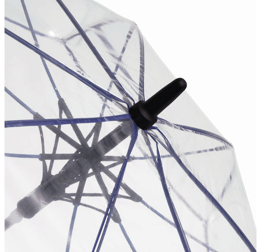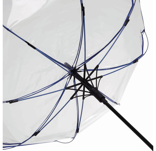 Автоматический зонт VIP: металлический стержень, цветные ребра из стекловолокна с металлическими наконечниками, пластиковый верх, пластиковая ручка со встроенной кнопкой нажатия, прозрачный навес из POE с цветным переплетом, закрытие с помощью кнопки
