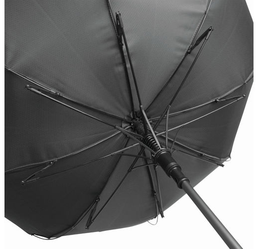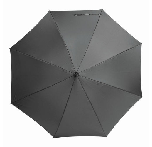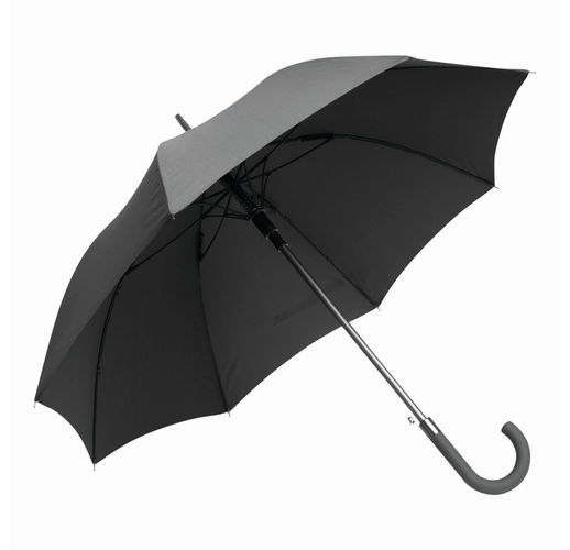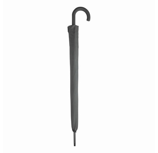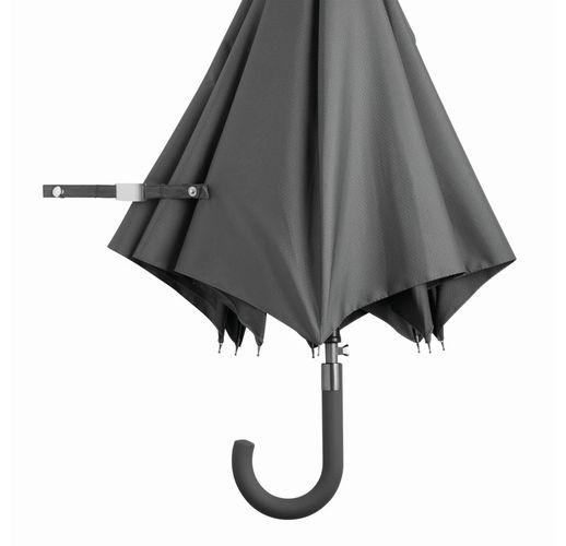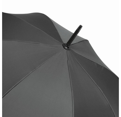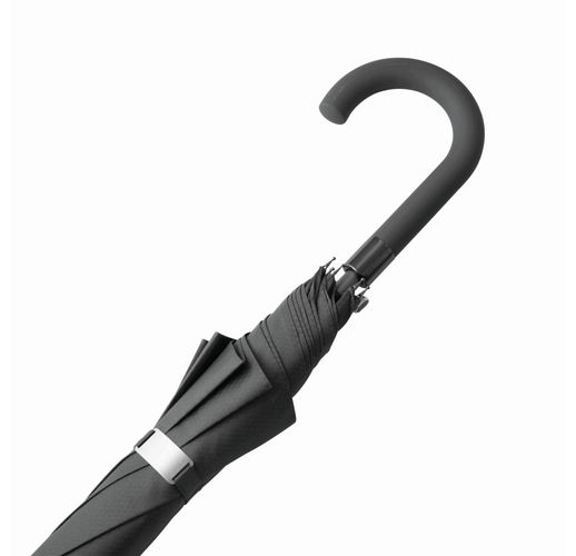 Автоматический ветрозащитный зонт JUBILEE: алюминиевый стержень, ребра из стекловолокна, металлические наконечники, изогнутая ручка с резиновым покрытием соответствующего цвета, навес и чехол из полиэстера с сотовой структурой, с застежкой-кнопкой и металлическая пластина для рекламы