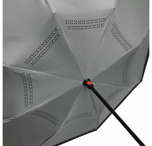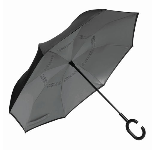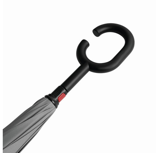 Зонт-палка ОТЛОЖЕННЫЙ: с обратным механизмом открывания и закрывания, с предохранительным бегунком, свободные руки благодаря С-образной ручке, двойная крышка с вентиляционной конструкцией для предотвращения застревания воздуха, металлический стержень и ребра из стекловолокна, с металлическими наконечниками, навес из полиэстера и эпонжа, закрытие на липучке