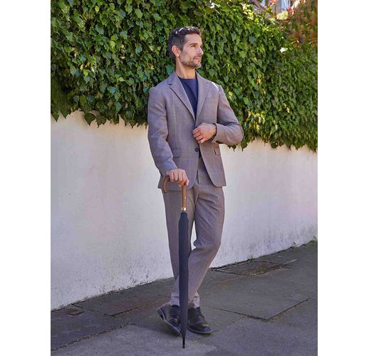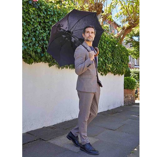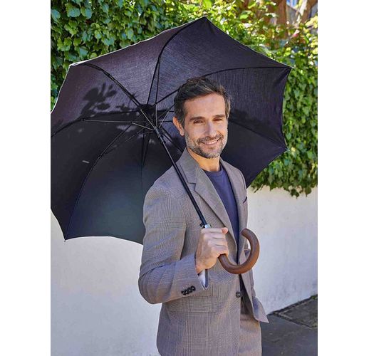 Большой фактурный купол сделан из люксового поликоттона и очень красиво и необычно смотрится на свету. Деревянная рукоятка с металлическим кольцом, под которое заправляются спицы, добавляет престижа и изящества.